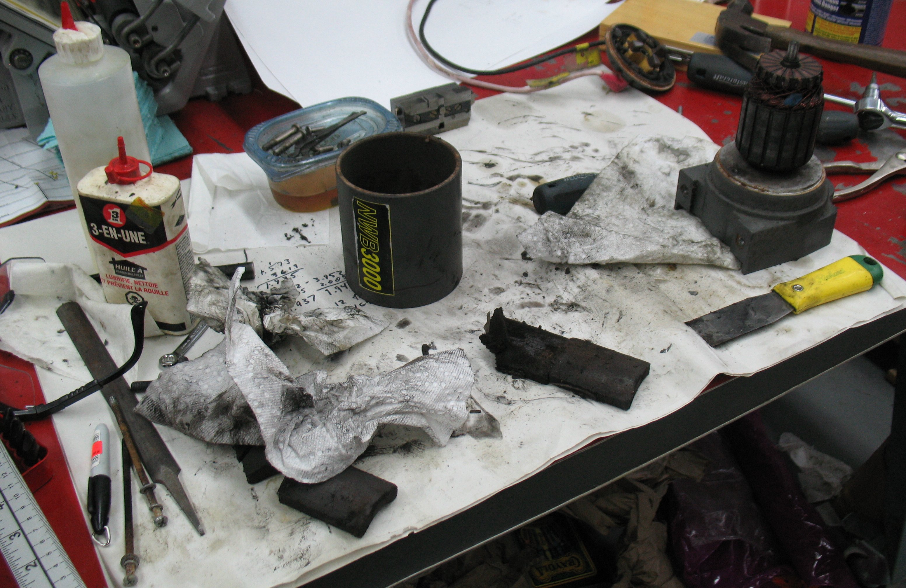 I reassembled the gearbox, then took the motor casing apart. This is a permanent magnet motor, and at least one of the magnets had come loose and was clinging to the armature. Every time the motor turned some of the face of this magnet would get ground off. The banging around each time the motor reversed also chipped and cracked the other magnets, so the motor was filled with black dust and crumbs in a whole range of sizes. The real problem, though, was that this was magnetic dust (and probably a good abrasive), and I was using the same workbench area I was using to refurbish a Monotype mould. I was certainly not expecting this sort of mess to come out of this motor.