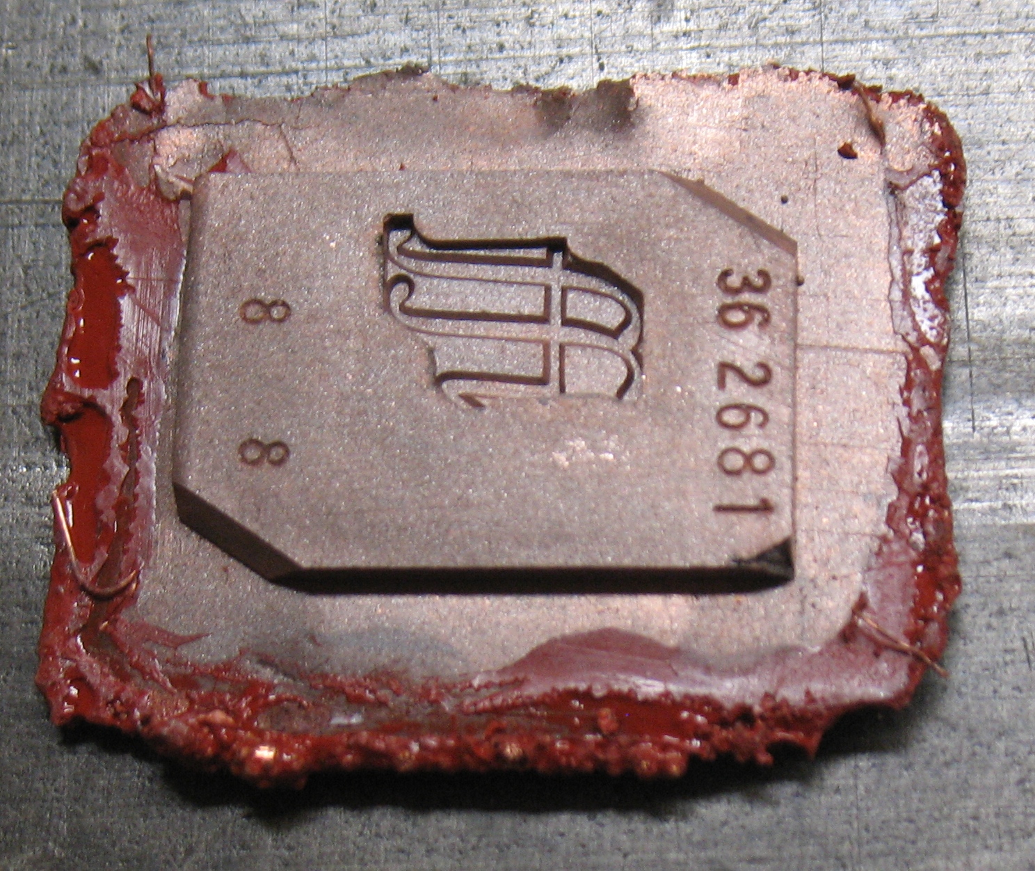 20140822IMG_7352Unfortunately, the matrix copy is not flat. Its front surface is domed and when placed face-down it rocks back and forth. I had thought this might be caused by the force required to peel it off its mould, but a subsequent attempt to flatten it demonstrates that it is not flexible enough for that to have occurred. The matrix was well adhered to its mould, so it would appear that the rubber mould must have also been in a dished shape.