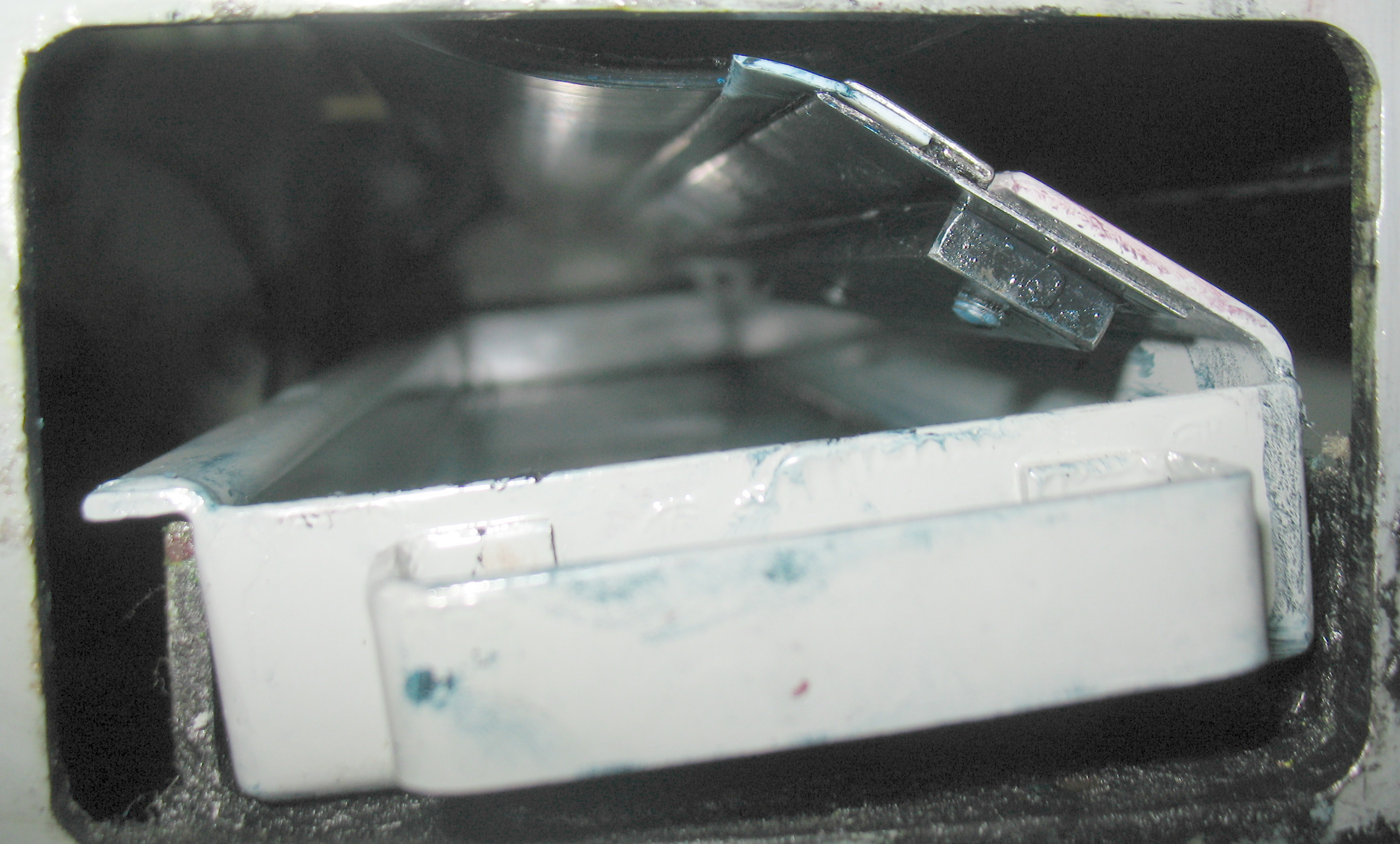 The first photo shows the washup unit in its idle position below the powered ink drum. The blade (white) is not quite touching the drum. Engaging the washup unit (second photo) raises the right side of the tray causing the blade to press against the drum and wipe off its ink film. Ink on the rest of the ink train gradually transfers to this drum so eventually all the ink should be wiped off. If you look closely, however you can see that the PTFE blade is flexing so much that its edge is not contacting the drum; instead the heel of the bevel is on the drum. This makes the wiping much less effective and causes some of the wiped ink to run off the upper side of the blade and thus not get caught in the tray.
