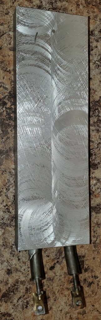 The heater ready to install. There is a small steel pin, visible near the top, which keeps the heater centered when the metal block is cast.