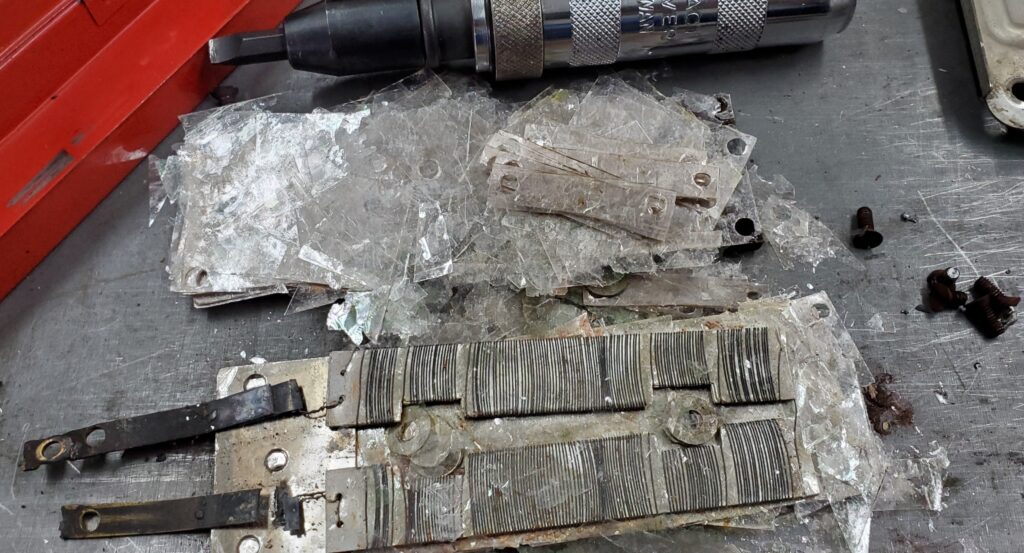I later took apart the old heater. The two side plates were held together by seven flat-head steel screws, which required a manual impact screwdriver to remove (several actually snapped off). With one of the plates removed, the heater fell apart into a pile of mica along with the actual heater strips. This mica was likely more solid when new but decades of heat and humidity caused it to delaminate and fall to pieces.