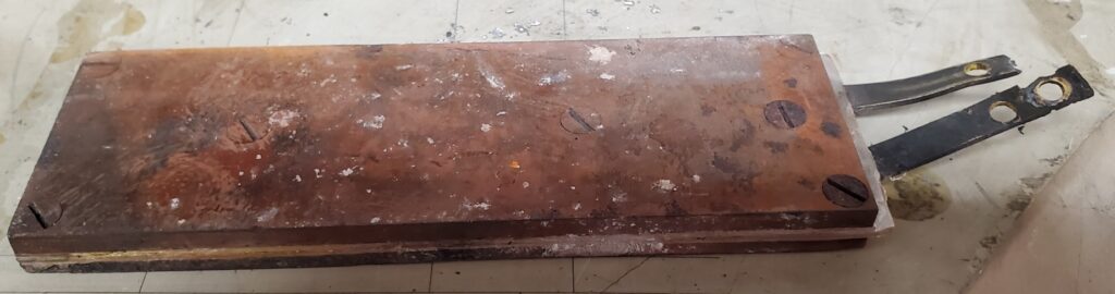 I got the old heater out. It consists of a sandwich of two steel plates with mica insulation and the heating wires in between. I later did a post-mortem on this heater—see below.