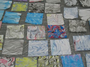 After lunch, rather than going through all the traditional patterns as we would in our normal marbling class, the ladies spent the time marbling fabric. They had plain cotton and some organza, and some of the fabric already had a print design while other pieces were plain white. They kept track of whose piece were whose by snipping corners off the pieces; each lady had a different number of clipped corners. Here’s just a small sample of the marbled fabric, still wet: