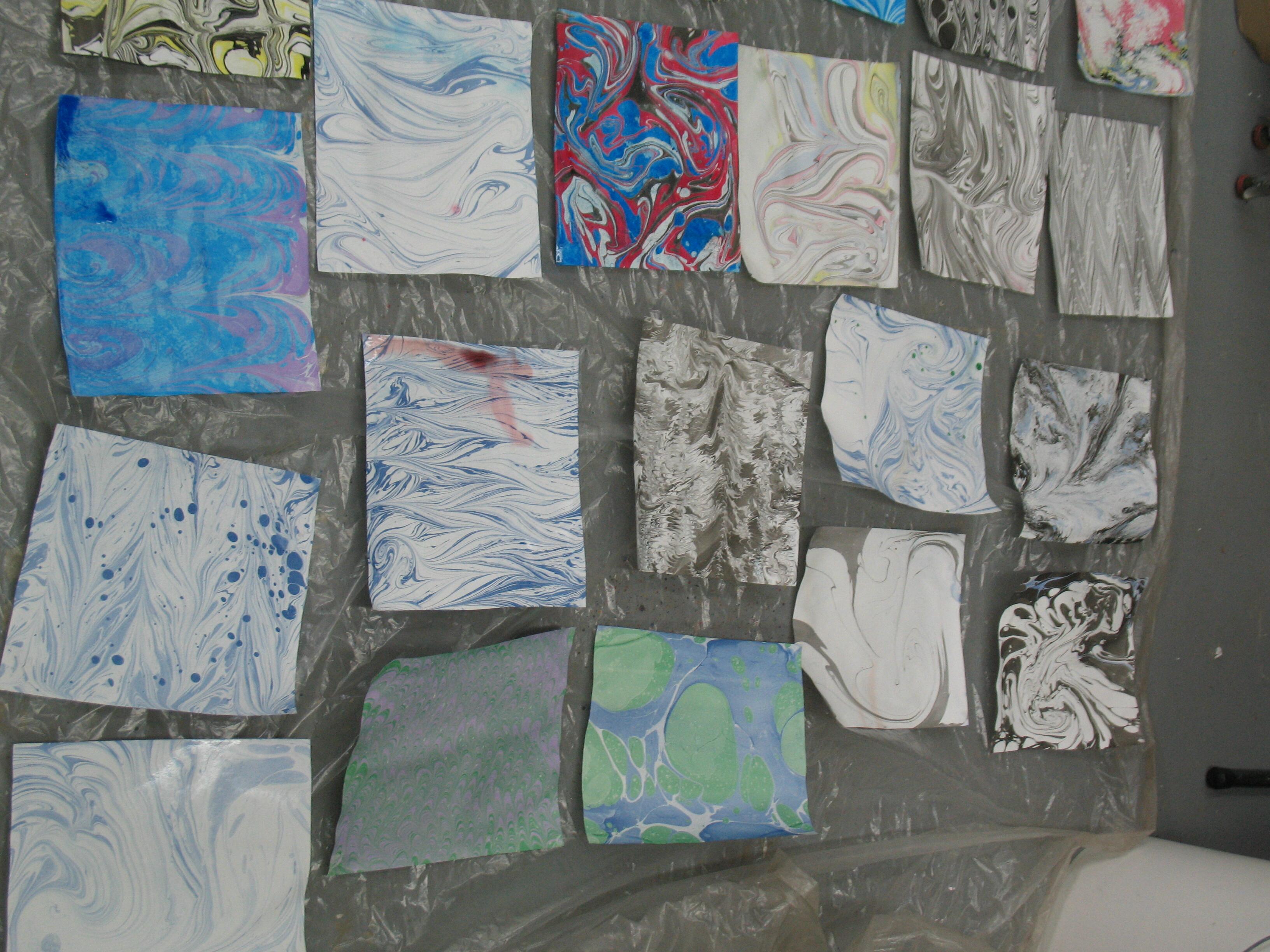 Here is most of the group concentrating on their work. Those are my hands in the lower right, adding paint to a larger tray to re-marble a sheet of paper where the first marbling attempt turned out a bit drab. Perhaps a second marbled pattern will improve it…
