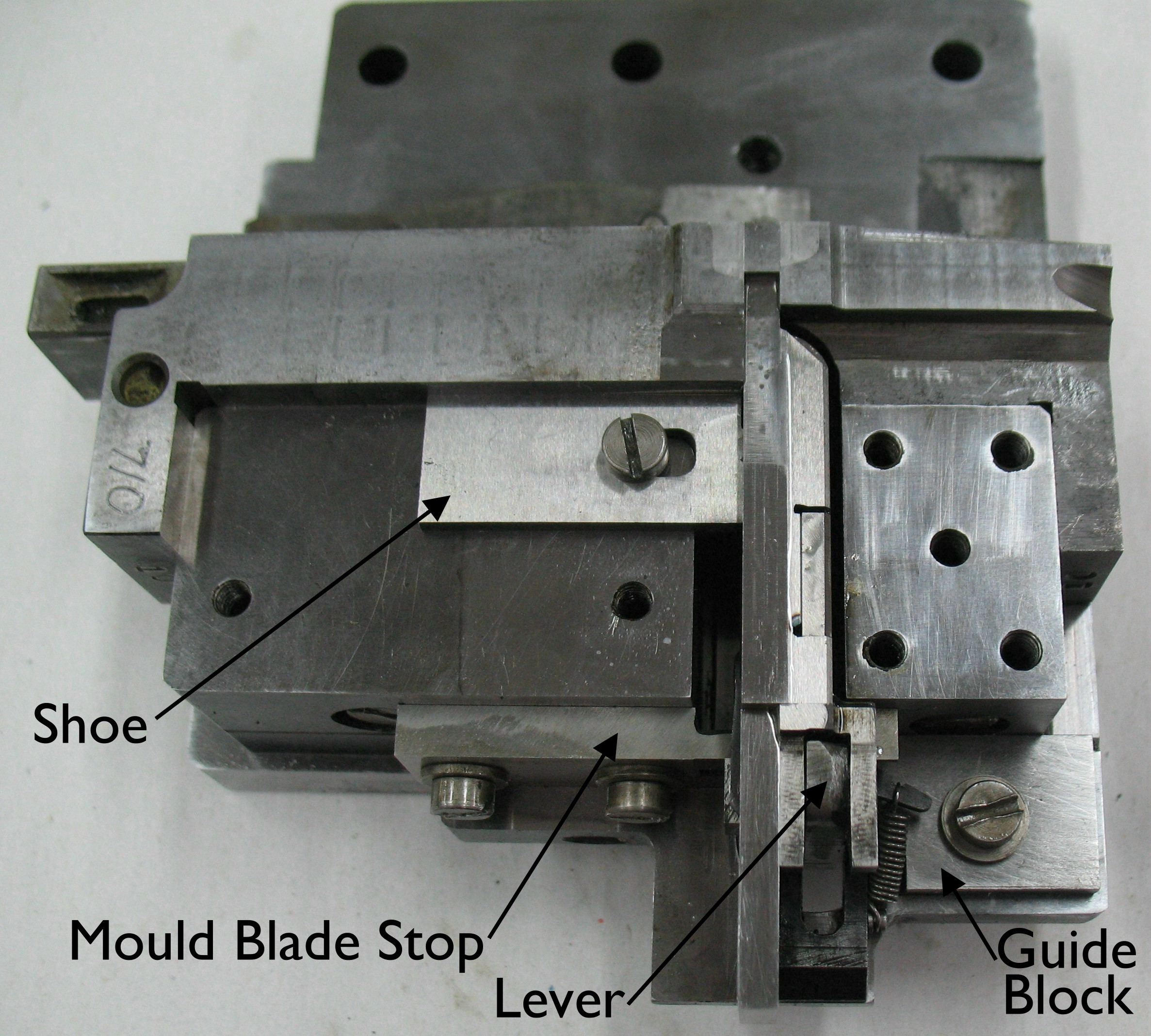 To correct this I don’t have to disassemble everything; I should just be able to loosen the eight screws that hold the squaring block and type blocks to the base plate. Before doing this, though, I will have to measure some other moulds to determine how far the type block fronts should be from the rear edge of the base plate. If they are too far the type carrier will rub the type block as I observed. If they are too close the type carrier will fail to pick up very narrow pieces of type as they eject from the mould cavity.
