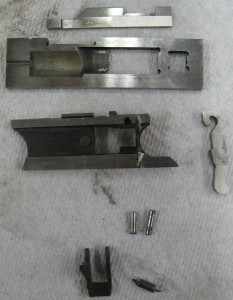 I have reassembled the blade, and it is shown on the left with the upper blade projecting beyond the lower blade, as if a very wide low space were to be cast. The lever cannot be installed until the blade is properly set into the mould.