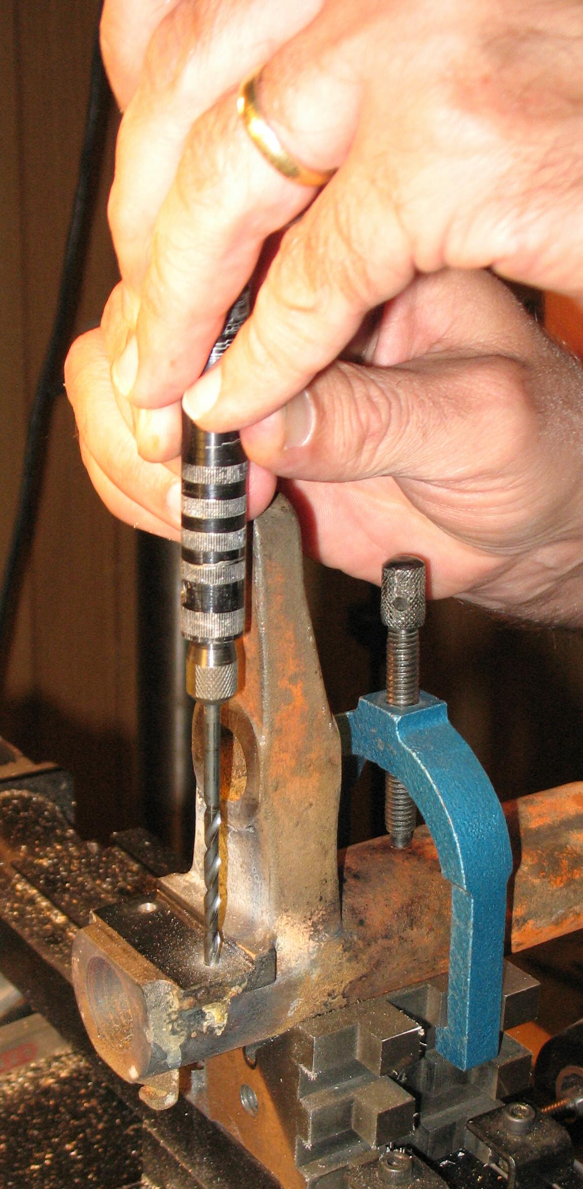In order to repair two threaded holes in the Monotype caster pump latch, I thought I would have to make an extension for my drill bit because the holes to be drilled were so close to a side arm on the part. However, it turned out that I could place the required drill bit (#29 if I recall) in the collet chuck of the flex shaft handpiece of my Dremel. It is a bit of a cheat since #29 is larger that the 1/8″ size the collet is made for but I managed to get the bit held properly anyway. It is also slow work because the Dremel motor easily gets bogged down. Essentially I have to turn it on to a speed that is far too high for a drill bit of that size, then apply enough drilling pressure by hand to slow the motor down to the right speed but not stall it completely. On the other hand the long handpiece makes it easy to visually keep the hole sufficiently square to the surface.