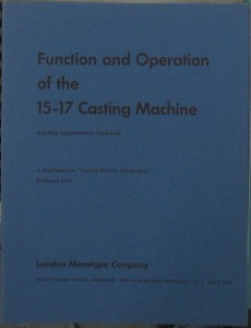 One of the books I recently acquired from Don Black has the rather bland title Function and Operation of the 15-17 Casting Machine but after reading this book, I see how the subtitles reveal its true importance: Including Supplementary Equipment and A Supplement to “Casting Machine Adjustments” Published 1930.