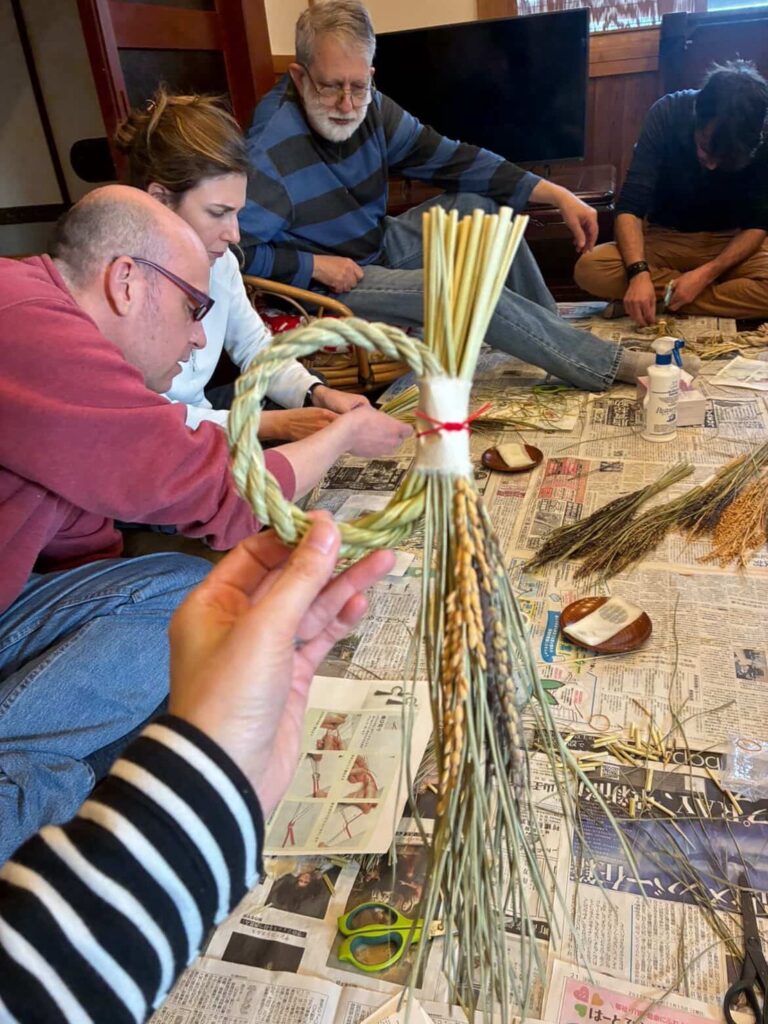 Before dinner we had a short craft project, making a traditional style of home decoration from rice straw. This was hosted at Chihiro-san’s father’s house (IIRC), which is just across the river from the studio and next to the Imai’s own house. These items are actually more than just decoration, but traditionally are also, for lack of a better description, a sort of fertility charm to ensure a good harvest of rice.