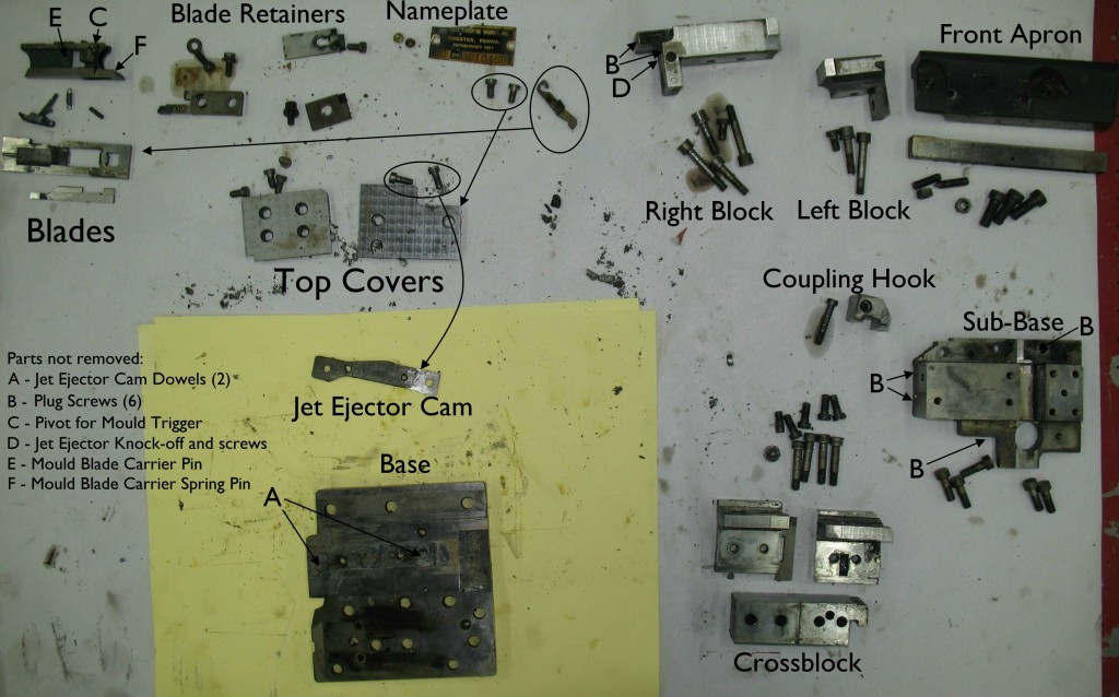 The exploded diagram for this mould is shown on page 38 of Plate Book, Monotype Typesetting Machine, the Composition Type-caster. The only difference I could find from what is shown in the manual is that this mould does not have the left mould blade guide 18MC3E1 nor its screw, nor even the hole in the top cover to clear the screw head (so it is not just a case of a missing part). Furthermore, the mould blade latch spring on this mould is a single piece with the end loops formed by bending the spring wire, while the parts manual shows a spring with separate end eyes that the last coil of the spring threads into.