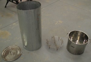 The extension pipe is made from two sections of 6″ round heating duct joined lengthwise to make a 12″ tube. Because of the geometry of the locking seams I had to add a few pop rivets to hold it together. This turned out to be a perfect fit in the pot.