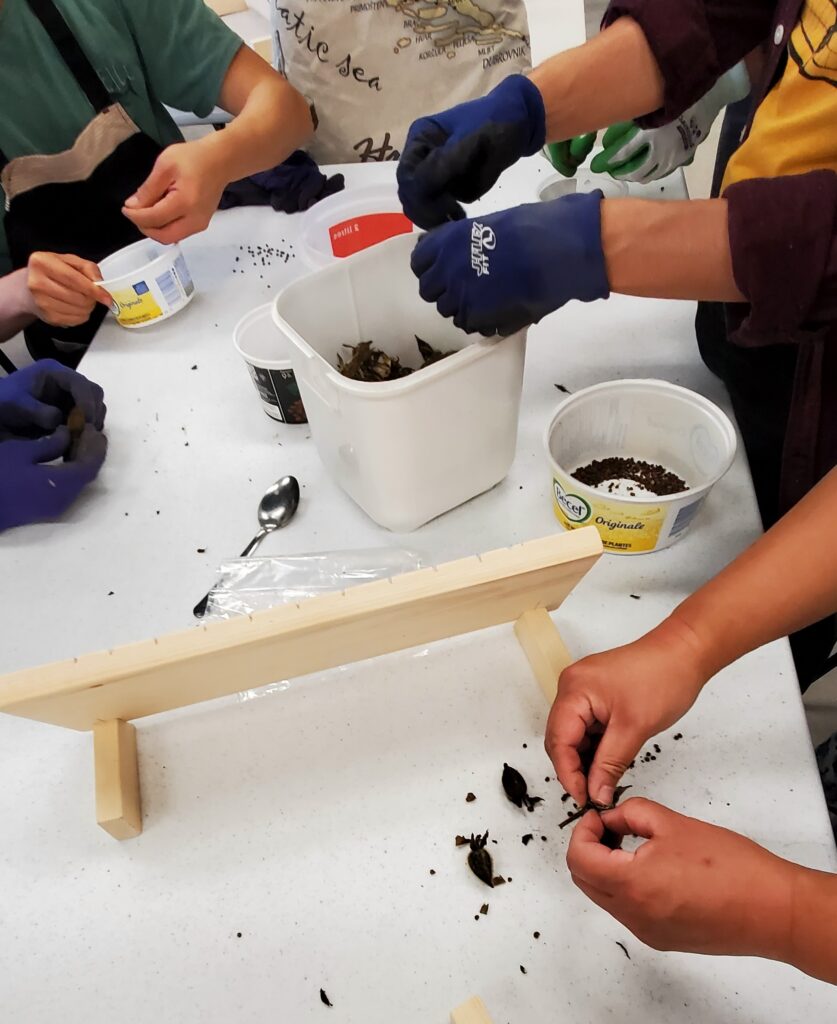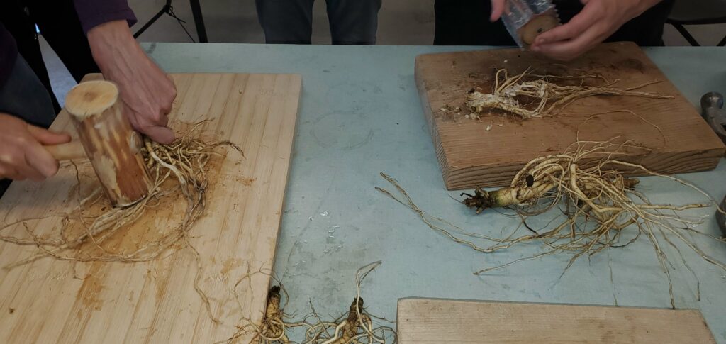 Although making the su was the centrepiece of the workshop, we also spent some time harvesting tororo-aoi (to make neri formation aid) from the community garden, collecting the seeds, and processing the roots: