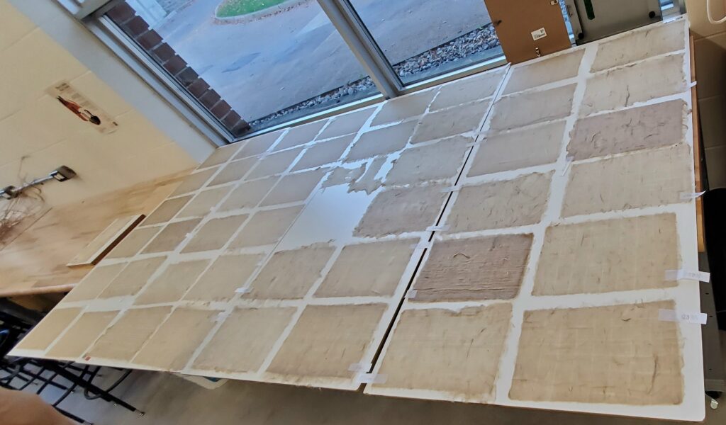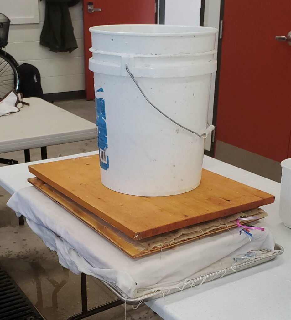 While we were cleaning up, we pressed all four posts together, using a bucket of water as a weight.Without couches to separate the sheets, slow pressing is essential, so every ten minutes we would add 2 more litres of water (1kg, or about 4½ pounds) to the bucket. When the bucket was full we added a second bucket (splitting the water between them) and continued adding weight. Over a period of about 2 hours we added a total of about 30 litres of water (30kg or about 66 pounds). This is very light pressure, about 0.7PSI or 5kPa, compared to the pressure used in western papermaking, but it seemed sufficient to allow handling the wet sheets, especially with the ribbon along one edge. We removed the pails and separated the sheets, placing them on melamine-surfaced Masonite boards to dry.