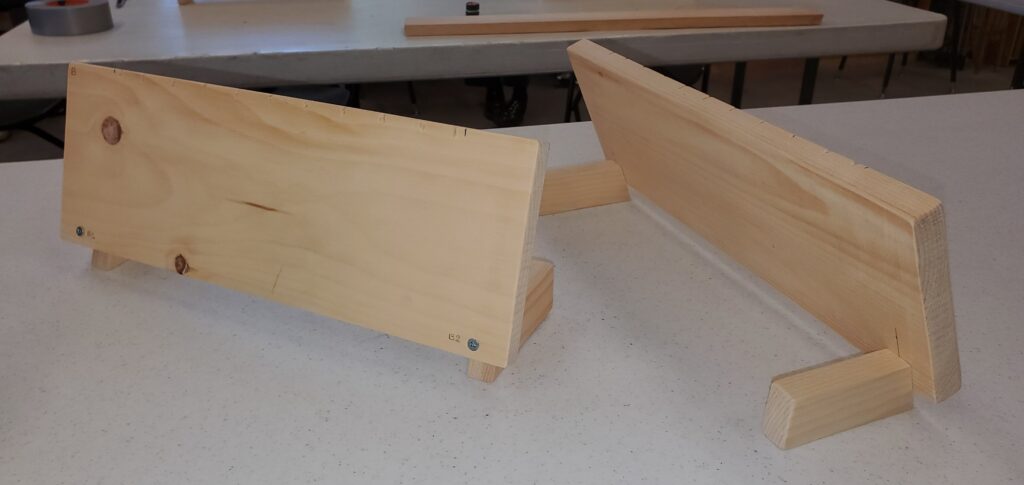 The weaving stands we used were a simplification of Barret’s, with a single notched board and attached legs:The weaving bobbins were short pieces of ½″ rigid PVC water pipe, weighted with epoxied-in lead shot, and fitted with two rings of ½″ inside-diameter flexible (vinyl, perhaps) tubing to form the “sides” of the bobbin. The groove left for winding the thread was a bit small for the heavier nylon we were using, but otherwise these worked fairly well, and the vinyl hoses made for relatively quiet weaving. Alex had had problems with the epoxy, and also finding lead shot (hunters are moving to other metal shot to avoid scattering lead through the environment), so we discussed other ways of making bobbins, and particularly weighting them. I think a relatively easy method would be to take short (1″ perhaps) lengths of round ½″ steel rod, and add two rings of rubber or vinyl hose to form the sides. These should both be available from pretty much any hardware store; you just need to find hose that fits tight enough.