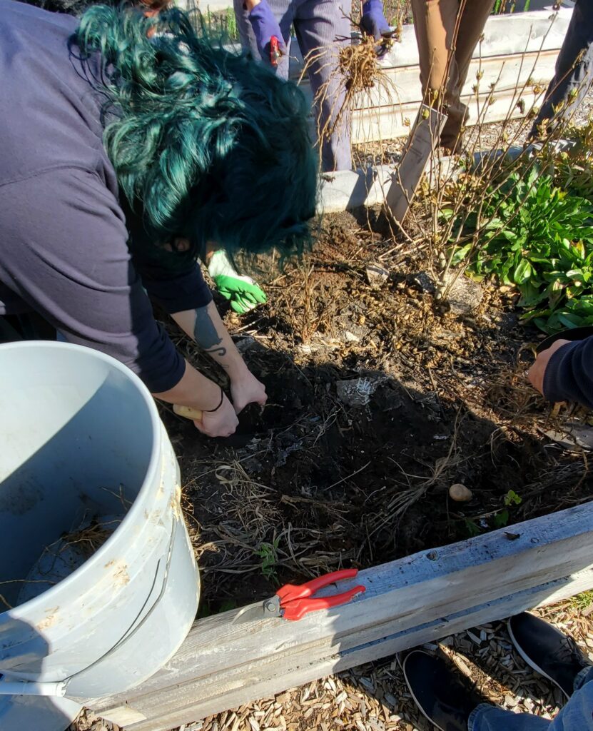 Harvesting the plants, roots and all. Frost has killed the foliage making the plants hard to see in the photo.