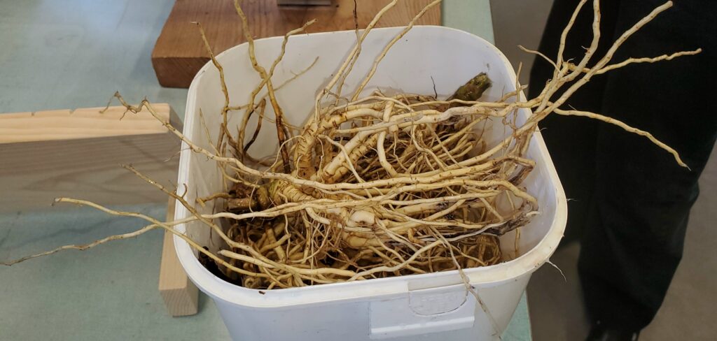 The roots after rinsing off soil. This turned out to be much more that we needed, so unused roots went into the freezer.